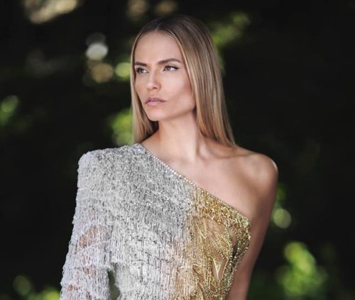 The Winter Palace dress features a special embroidery of crystals, beaded fringes and micro-sparkling elements feathering from golden to silver and clear sparkling shades for a ‘crystalized’ effect.