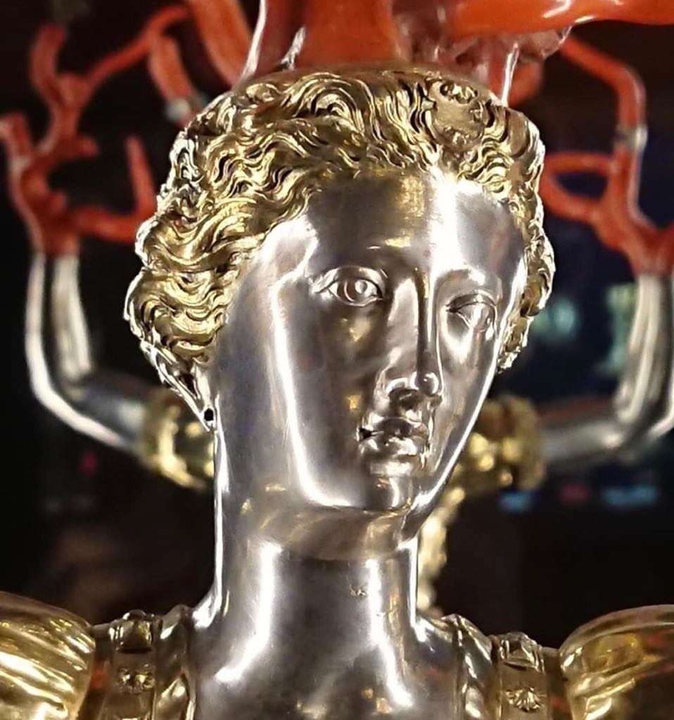 Wenzel Jamnitzer ha dato forma ad uno dei miti più belli dell’antichità e mi piace pensare che la decisione del colore rosso e non verde dei capelli di Dafne, sia stata dettata dal verso di Ovidio, in cui la ninfa s’imporporava di “verecondo rossore” ogni qual volta il padre le parlava di matrimonio.