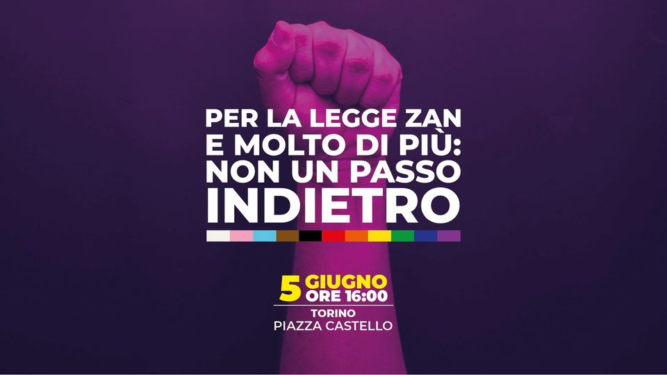 Ci vedremo il 5 giugno alle 16:00 in piazza Castello per manifestare in favore del DdL che contrasta discriminazione e violenza per motivi fondati su sesso, genere, orientamento sessuale, identità di genere e disabilità.